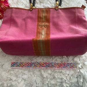Well loved extra large tote/purse/shoulder bag by designer Tory Burch. Pretty Pink canvas w/orange and tan leather branding stripes both sides. Gold tone zipper closure top. Sturdy dark brown braided dual detachable handles w/gold hardware & lobster claw clips