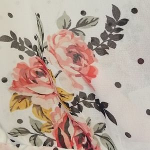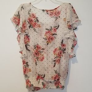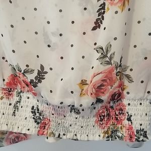 Comfy and flowy sheer blouse. Cream color with beautiful floral and polka dot print. Ruffled sleeves and elastic waistband.