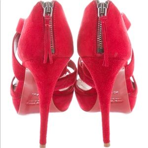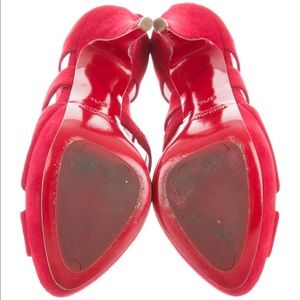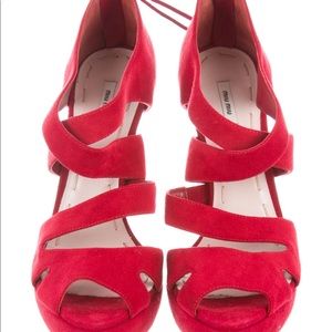 Red Suede Miu Miu peep-toe pumps with multistraps, tonal stitching, covered heels and zip closure at counters. Includes box and dust bag.