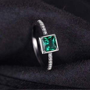 - Main Stone: .53ct Princess Cut Nano Russian Simulated Emerald Gemstone, Clarity Grade: VVS (Excellent Quality)