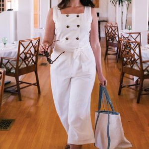 "White linen jumpsuits are one of the favorite warm-weather staples! Its square neckline and wide cropped legs are as chic as they are comfortable!" It's also lined so it's not see through.