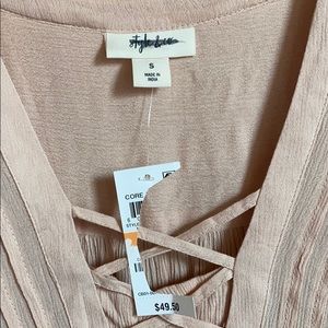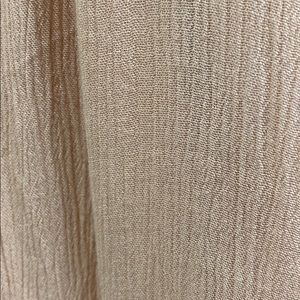 Very pale pink or ‘blush’ is the color of this stylish top. Cross cross straps with fabric underneath extend to make an empire waist look. 100% rayon with crepe look on bodice and sleeves. Long sleeves with elastic at wrist. Size S. Measurements seam to seam underarm 19”. Length approx 27 1/2. New with tag