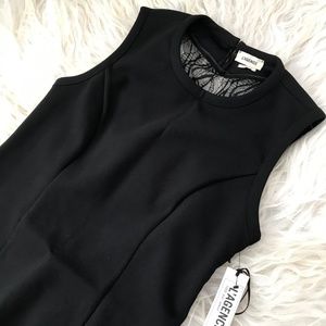 Black L'Agence sleeveless knee-length dress with crew neck, lace accent at back and concealed zip closure at side.