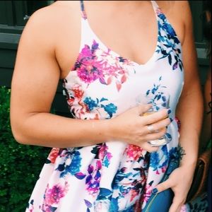 Adorable satin cocktail dress perfect for summer weddings! Bright, floral pattern is super flattering and the length is short but definitely modest. Some slight discoloring on the inside neckline from self tanner - this dress was worn once.