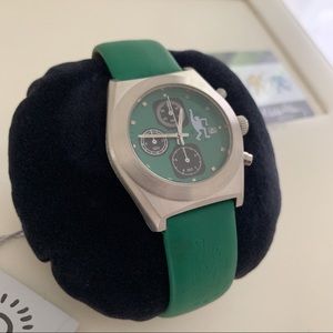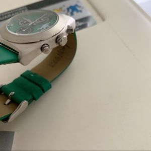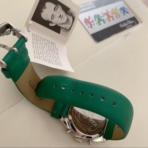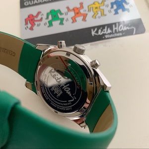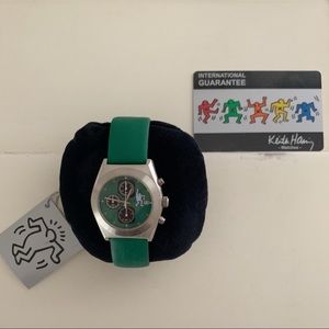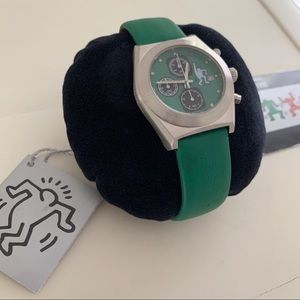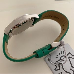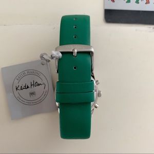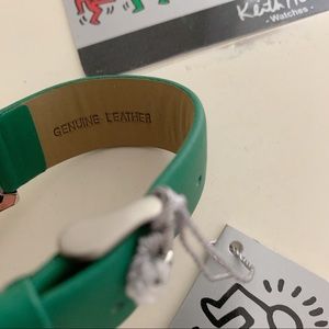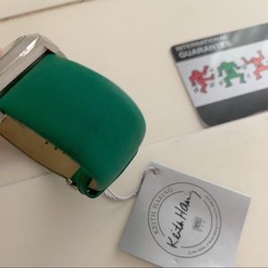 Keith Haring Green Leather Watch. Logo band. Very stylish and rare piece! The Estate of Keith Haring / Licensed by MMI NYC. New With Tag and card. Probably from the 90’s. Cool watch for art lovers. There are some minor marks on the leather from age as pictured. Some creasing/indents on band from age - see photo. Needs a new battery.