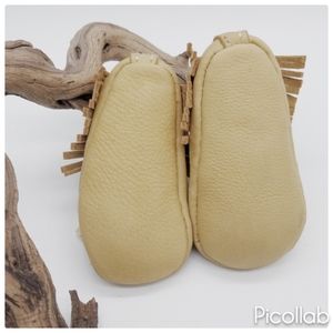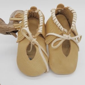 Genuine Baby Fringed Moccasins: size 6-9 months. Length: 4.25". Leather is natural cowhide and so soft/supple. Leather has natural markings from hide. Brand new with tags.