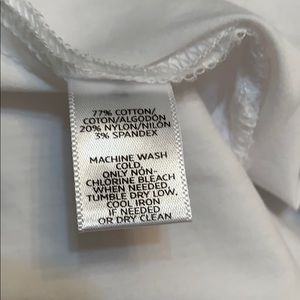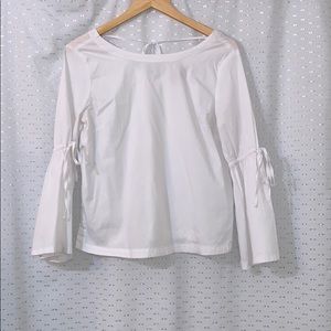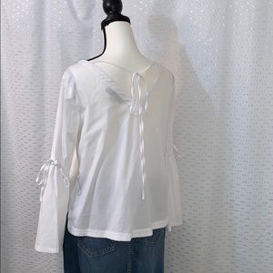 Boat neck on the front , v-neck on the back with ties, long bell sleeves that tie at the elbows, cotton and spandex. EUC, only wore it a couple of times.