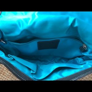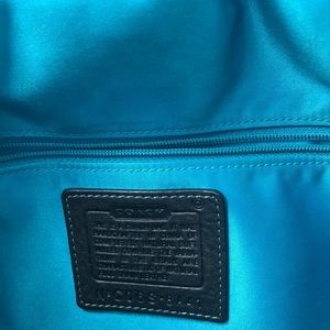 Super cute, Coach shoulder bag in black leather with turquoise stitching and lining. Accentuated with silver tone hardware and a stylish, brown leather strap that’s adjustable. In good, gently used condition. Overall, very clean except for slight discoloration on the inside due to normal wear. Hardly noticeable. Strap drop 10”. PRICE HAS RECENTLY BEEN REDUCED