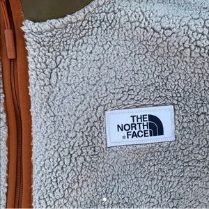 Beige fur with an orange lining around zipper, wrists, and bottom hem