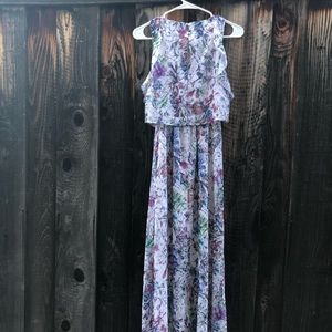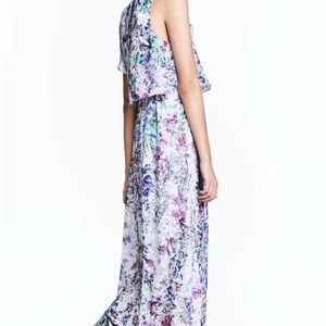 NWOT, never worn H&M multicolored floral print maxi dress from the Miranda Kerr collection. Pink/Purple/White flowers. Ruffle details, elastic waist, neck button closure. Double slits on the sides. Lined. A lovely daytime dress!