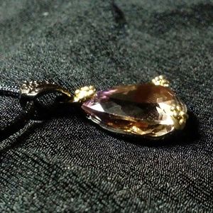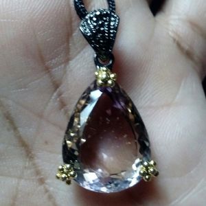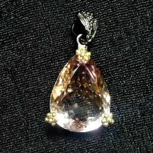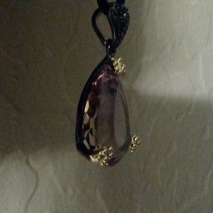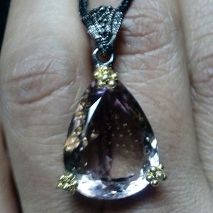 Sit in a Midnight Garden with this dark silver collection. Invest in life long jewelry, quality gems in genuine sterling silver, you will pass on to the next generation. True quality jewelry you will be proud to wear or give as a gift. Be the envy of your friends with this one every time you wear it. Feminine and delicate pear cut, light ametrine. Natural amethyst and citrine together in one. Flower prongs kissed with gold over silver. Make this yours. Cord necklace not included.