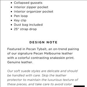 This is by far the best purse from Brahmin using a snake skin print that I have ever seen and it is completely sold out everywhere! I paired this gorgeous Mini Camila Pecan Tybalt Satchel with an equally handsome Mini Suri Pecan Wallet. This matching set was well worth the wait and exceeded all my expectations.