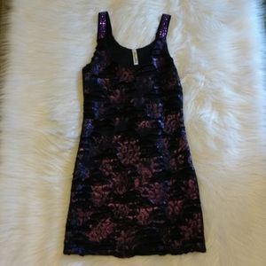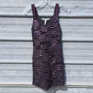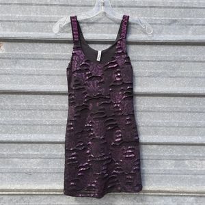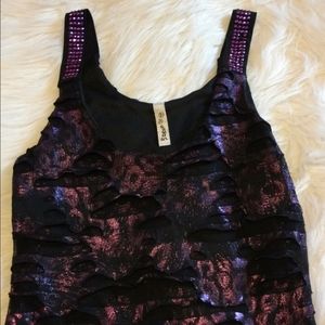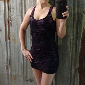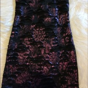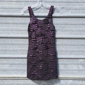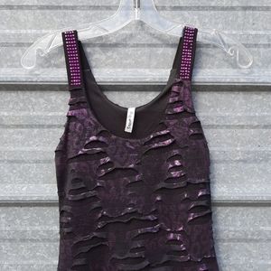 Overall fun dress. Black and purple metallic in color. Shimmers at every turn. Solid black silky inner lining with a slashed outer layer. Only sign of wear is two missing rhinestones on the shoulder strap but trust me if you are wearing this dress no one will notice! Excellent condition from a pet and smoke free home.