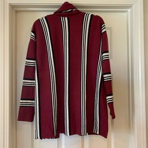 Brand new. Burgundy wine with black and white stripes. Stretchy. True to size- if anything slightly big. Flattering vertical stripes. I LOVE this cardigan. 29” long. 55% viscose, 45% nylon. Bundle and save.