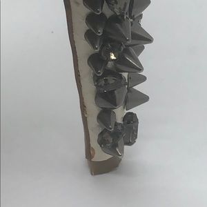 Snakeskin is off white, where the studs and gems are a gunmetal color. Excellent used condition, a few signs of wear. Material inside is peeling in a few areas. Right heel is missing three gems, left is missing one. Left heel has slight discoloration. Soles have some wear as well.