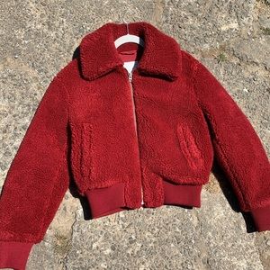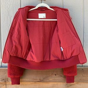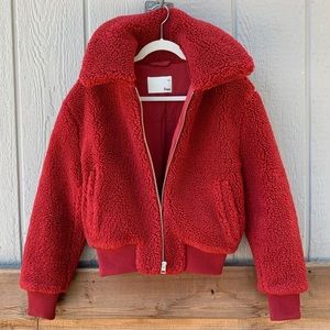 Wilfred Free red plush oversized full zip teddy sherpa jacket semi cropped