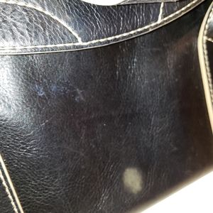Pre-owned Black leather Max New York handbag. Fun and roomy bag with 3 compartments. Lots of evident wear on the handle and piping as shown in some of the photos. The magnet that holds the bag closed is not working.