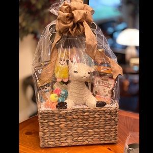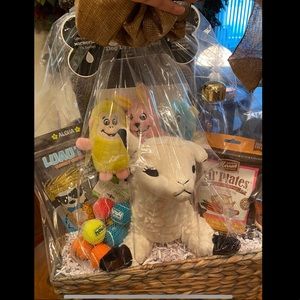 Beautiful gift basket for the dog lover! Filled with toys, treats and specialty items for pampered pooches and their “pawrents”, a dog basket is sure to delight anyone who receives it.