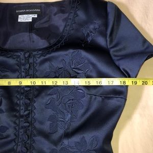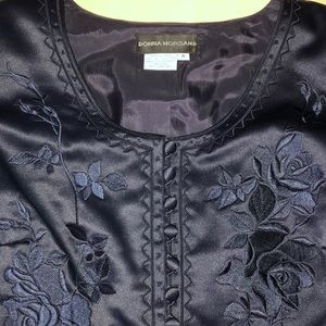 Gorgeous 2 piece embroidered formal dress from Donna Morgan. Could be mother of the bride. Has a long floor length skirt and button up scoop neck top. Really really nice. Lined. The pictures don’t show how beautiful this is as the polyester doesn’t take well to the flash. Super nice.