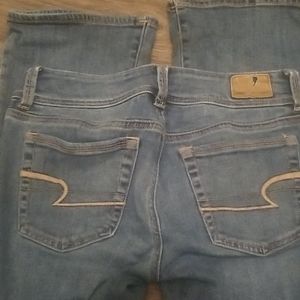 AE Super Strech jeans. No distressing, super comfortable. Boot cut style I think. Worn a handful of times.