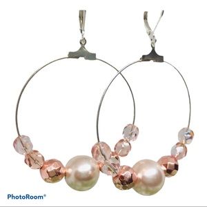 BOUTIQUE Pink and Pearl Beaded Hoop Earrings, Large Dangles, Czech Glass Beaded