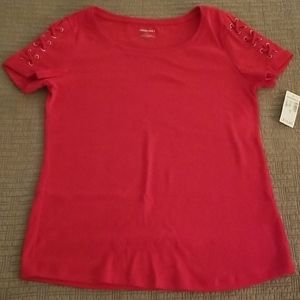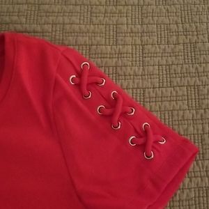 Super cute round collar, t-shirt material, short sleeves with tie accents on both.