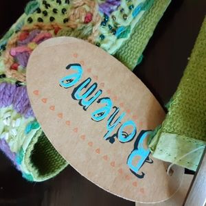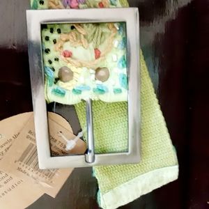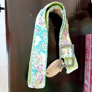 Artsy fair trade Boho Belt in green, blue and purple with Square buckle and beaded. Made of recycled materials. 100% Cotton