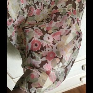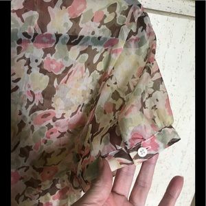 Super lightweight feminine blouse with ruffles on the front. Very soft. Button on short sleeve. 100% poly. Says dry clean but washes beautifully. Pastel peachy pinks, greens, tans on ivory.