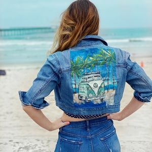 Inspired by a hippie beach lifestyle this wearable art jacket is designed to instill peace and fun.