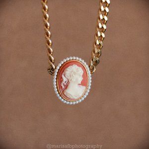 White Cameo on Pink background, Gold chain.
