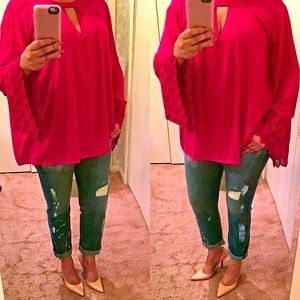 A line top with Keyhole Neckline and Lace Details on sleeves. Cotton blend.