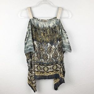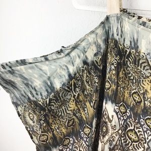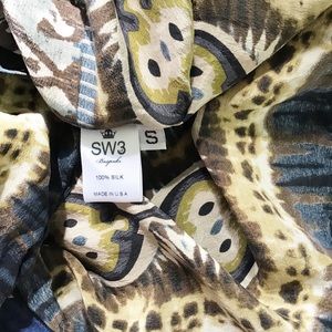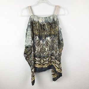 SW3 Bespoke Cold Shoulder Silk scarf Top in an abstract brown/tan gray pattern. 100% Silk