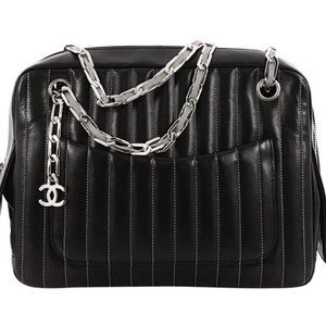Mademoiselle Ligne Vertical Quilted Camera Bag in a good condition. Black vertical stripe quilted lambskin exterior trimmed with silver hardware and a unique woven chain and reflective ribbon shoulder strap that can be worn long or short. No stains, smells or major scuffs. Clean corners, edges and interior. Fabulous reflective shoulder strap that shines at night. It is a gorgeous bag that's a modern twist to the classic camera bag. Small split of the linen interior shown in last pic. No odor