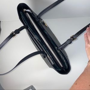 Measurements: 13” W on bottom to 16″ W on top x 10.75” H x 4.5” D. Handle drop: 10"
