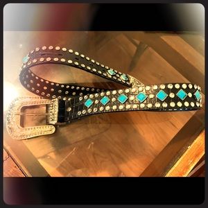 SOLD Belt Brown Leather Rhinestone Turquoise