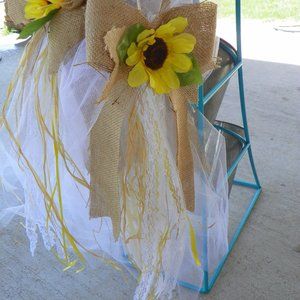 A group of 5 white flowers with white bow, pink tulle, ribbon, & lace. They measure 20" long & 7" wide.