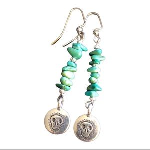 These handcrafted earrings are made with turquoise chips and round skull charms on fish hook ear wires. Ear wires are nickel free. Earrings measure 1 3/4”. Skull charms are not double sided - see picture. Gorgeous greenish color turquoise. Designed and handcrafted by me