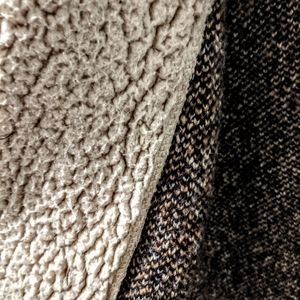 Soft with fleece around the collar, easy fall jacket. Please note it doesn't button or zipper. Two big pockets on front also