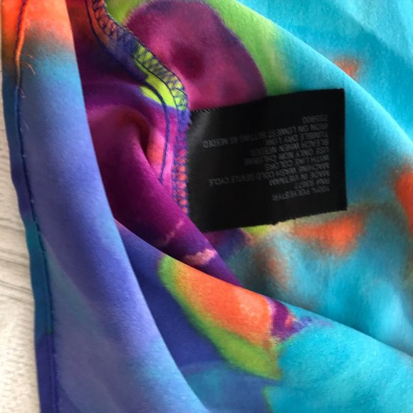 Very colorful in an abstract print pattern of turquoise with yellow/green, orange/magenta and purple colors throughout