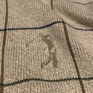 like new! men’s size large by fairway sport. cotton blend. tan grid print. embroidered golfer detail. comfortable grandpa crewneck sweater fit.