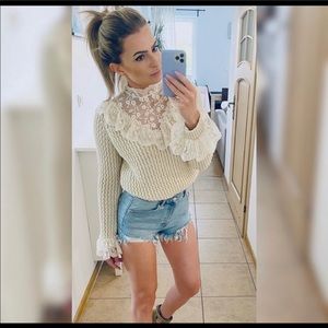 Beige knit top with lace on wrist area as well as on high collar