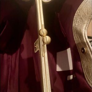 The center compartment has a kiss lock closure. The interior is clean and spacious. The exterior is in good preowned condition.