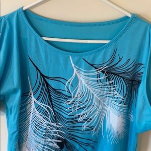 This is a women’s cold shoulder shirt in a size small that has been washed once and inner side tag removed, but NEVER WORN!!! It is a beautiful blue color a tiny bit lighter than the photos! It has a beautiful array of feathers in the front!!! A grey one to match in my closet also NEVER WORN!!! BUNDLE AND SAVE!!!