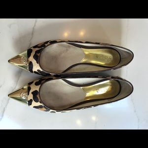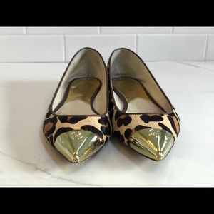 Michael Kors Leopard Paxton flats. Calf hair upper, leather lining, manmade sole. Imported. Metal cap toe with embossed logo. Size 7.5. Good used condition with some scuffs and minor wear. There is some fading and wear on the back of the left show. See the last photo for reference.
