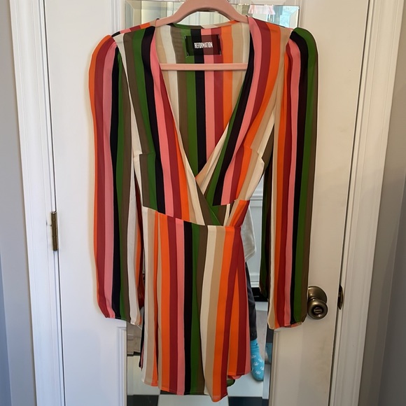 Reposhing this gorgeous Reformation rainbow striped Polk dress with tie waist detail and deep v neckline. Purchased from a seller NWOT. Never wore it because it didn’t flatter my figure