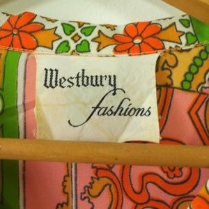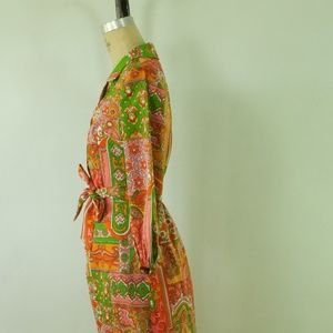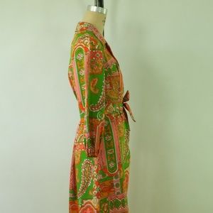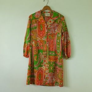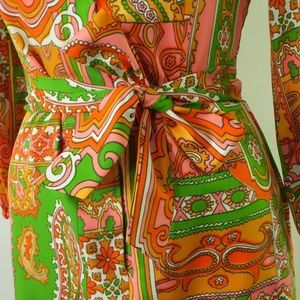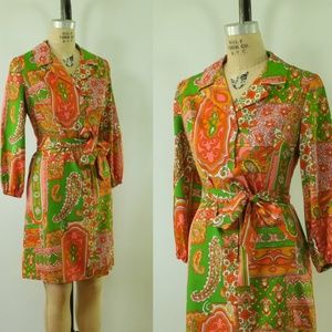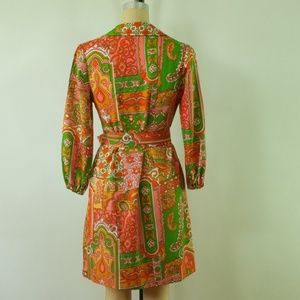 Funky vintage 1960s dress featuring a fun playful pattern in pink, orange, and white. It has a shirt like collar, bracelet/long sleeves with elastic cuffs, removable waist belt, 3 snap front closure, unlined.