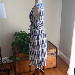 Size 10, hidden button front midi, tie waist, double from pockets, fully lined. Dry clean