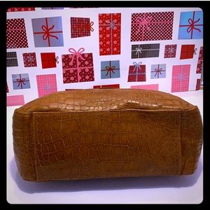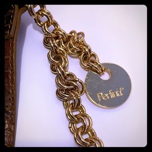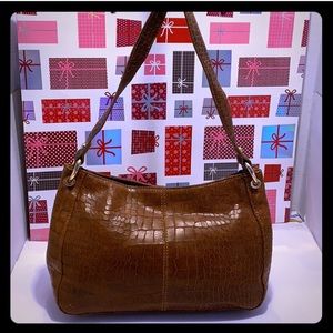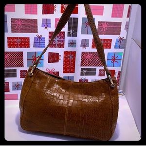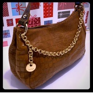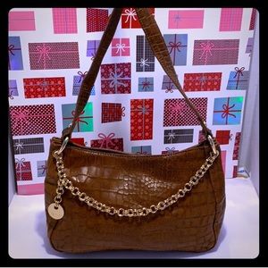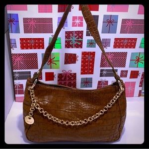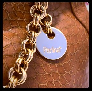 NWOT Perlina Croc Embossed Brown Leather Shoulder Bag with Gold tone Handle Chain. Measurements H: 8 inches L: 11.5 inches W: 4.5 inches. Perlina cars inside. Exterior: Soble handle; circular gold tone chain. Interior: Roomy; 2 slide open pocket on one side & zipper pocket on the other side. NEW Perlina with card care instructions.