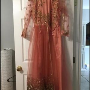 Available with a Poly Shantoon Churidar in Dark Peach and a Faux Chiffon Dupatta in Dark Peach