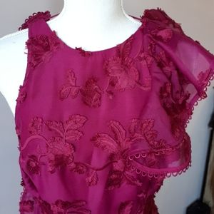Ruffled dress in raspberry. Scoop back with hidden zipper and a tie detail.